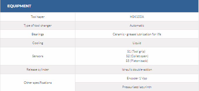 The spindle is equipped with a rotary joint that allows to cool the tool during the processing through the flow of refrigerant fluid through the shaft (CTS) or through minimal air-oil lubrication (MQL)