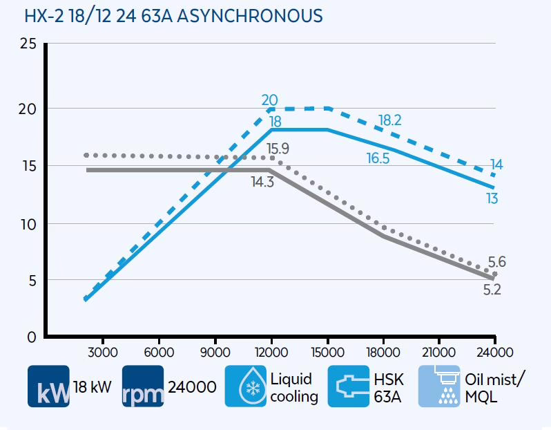 - Electrospindles available with a wide range of power levels (up to 25 kW)